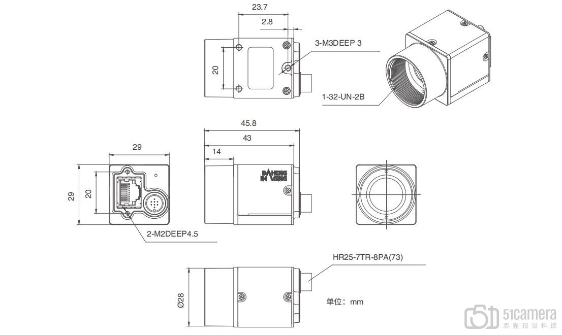 | 外形尺寸 | 29(W) × 29(H) × 29(L) mm(不含镜头接口和连接件) |